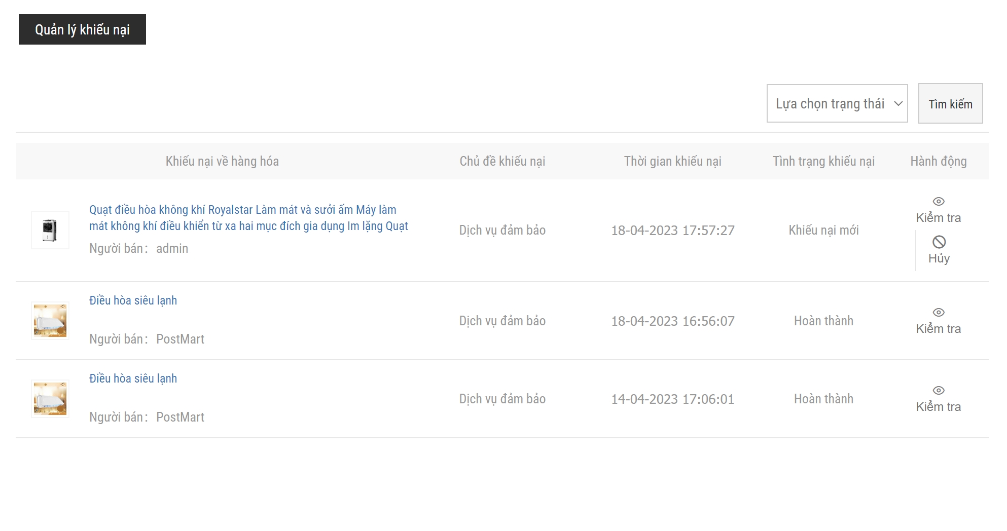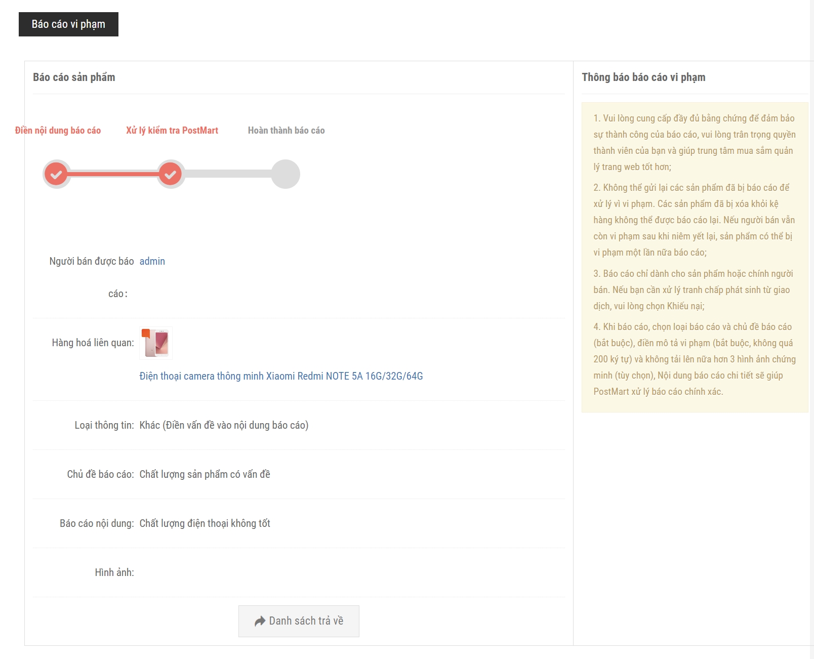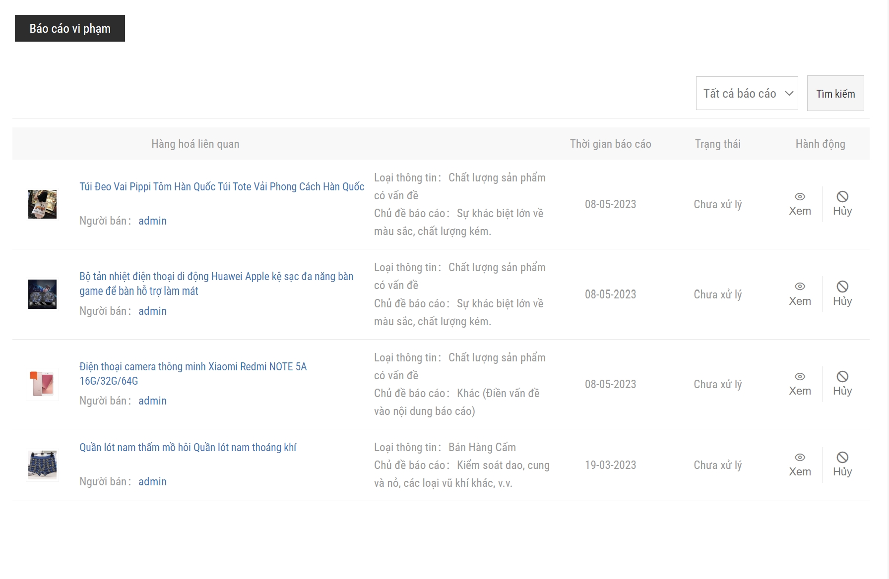 Chức năng giúp khách hàng quản lý những báo cáo của mình về những sản phẩm vi phạm nguyên tắc bán hàng của sàn TMĐT Postmart hoặc những sản phẩm kém chất lượng