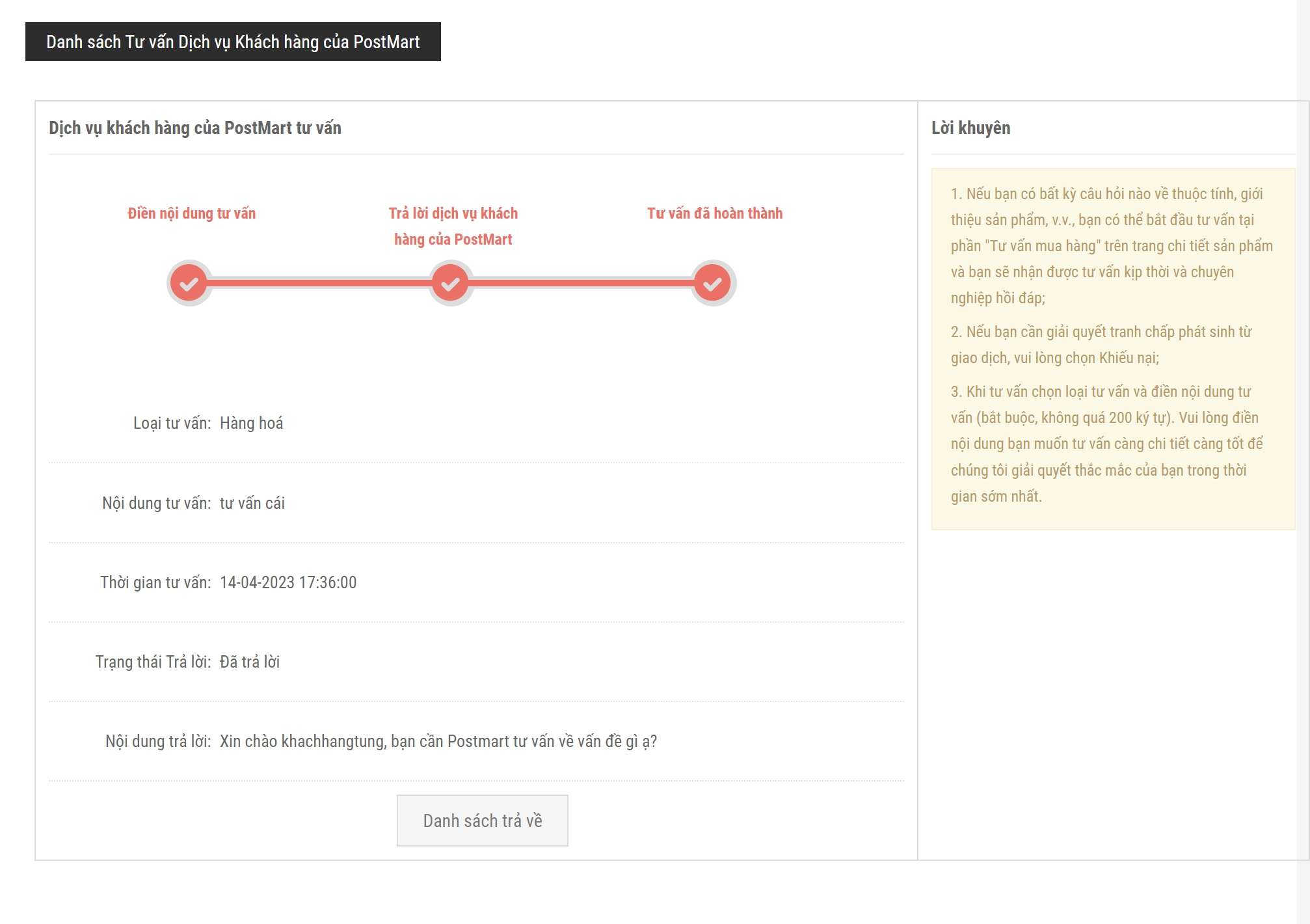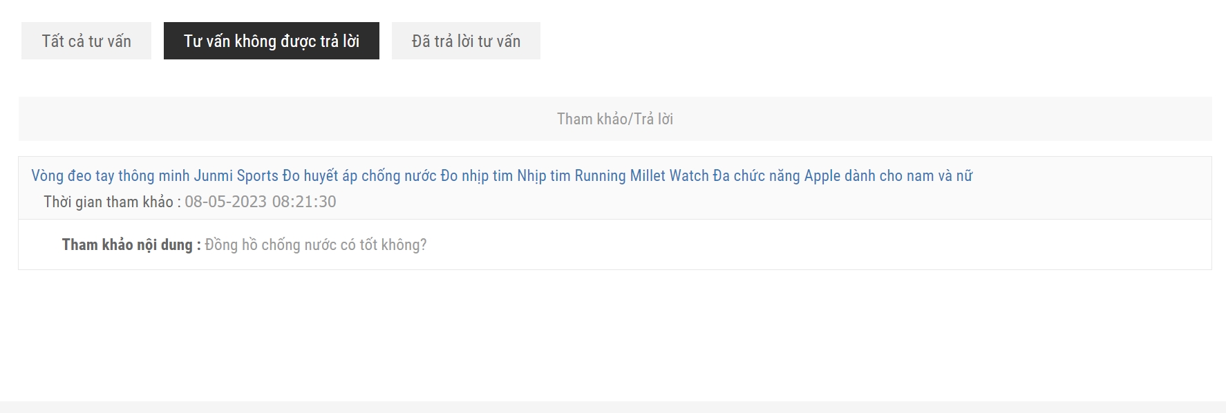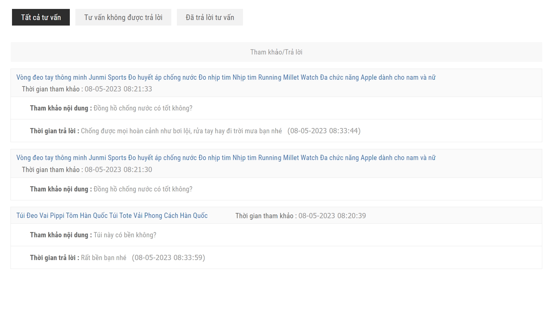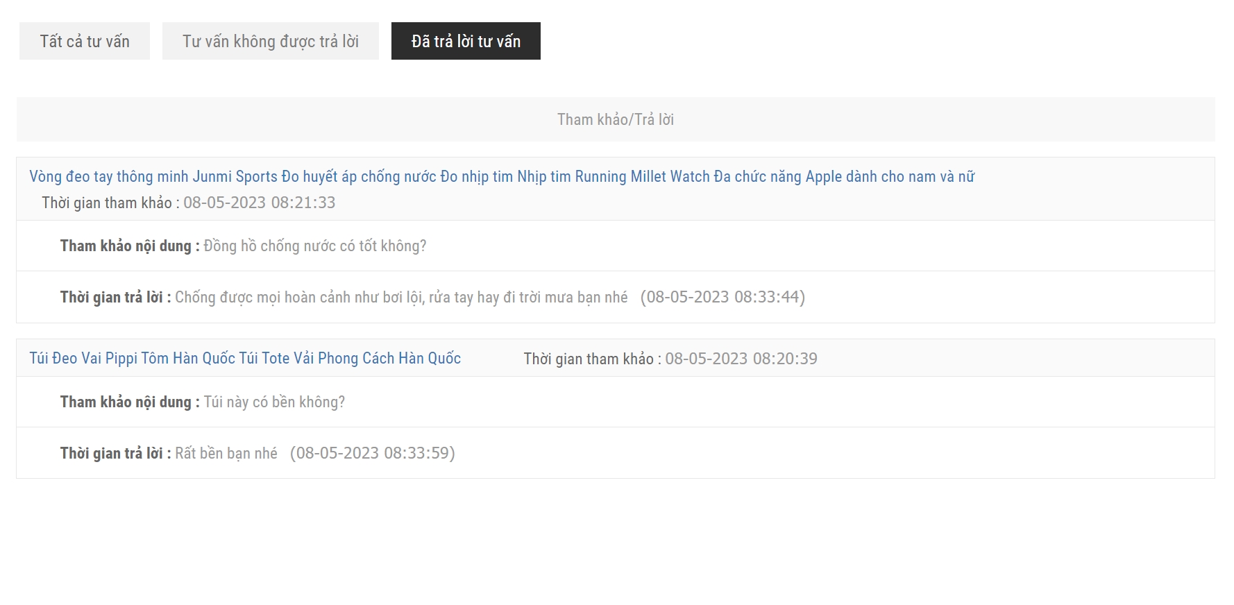 Chức năng giúp khách hàng quản lý và xem những câu hỏi tư vấn của mình và phản hồi của cửa hàng