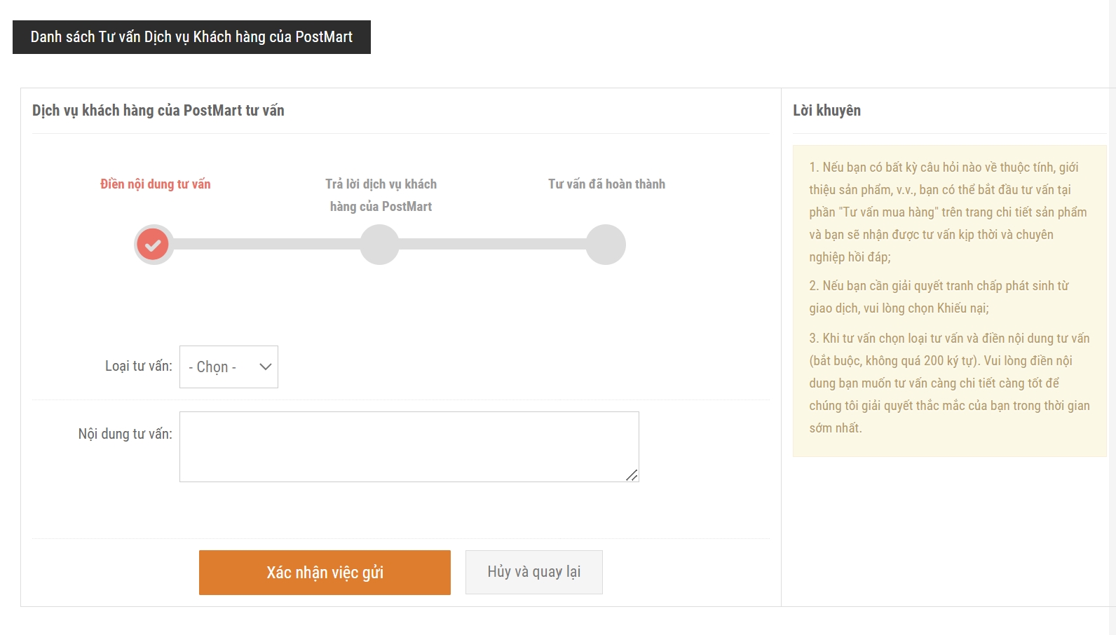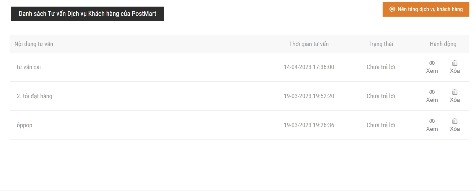 Chức năng giúp khách hàng đặt các câu hỏi cho bộ phận CSKH của Postmart